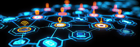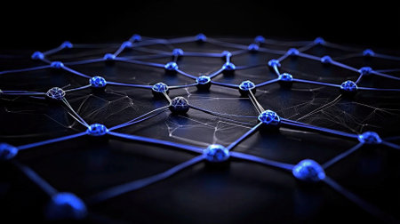 This image illustrates an abstract network of blue nodes and connecting lines against a dark background, symbolizing connectivity and advanced technology.
