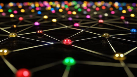 Explore a vibrant network of colorful nodes and illuminated lines representing digital connections. This abstract design captures the essence of communication and data flow.