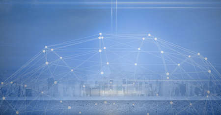 Composition of net of connections over a cityscape in background. global technology, digital interface, connection and communication concept digitally generated image.