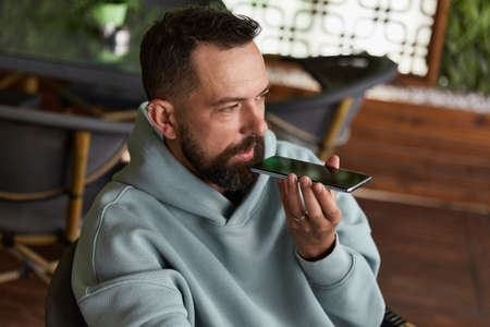 Serious young adult man in casual clothes in cafe records audio messages