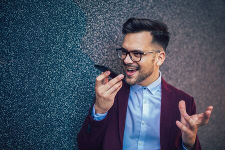 Young business man using voice command recorder on smartphone.