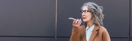 Grey haired businesswoman in coat recording voice message on smartphone near building outdoors, banner