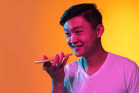 Close up of Asian young man talking on the phone isolated over orange yellow background in neon light.