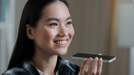 Portrait asian korean woman girl recording voice recognition message on speakerphone lady female at home using virtual assistant app sets reminder on phone at home office digital ai mobile assistance