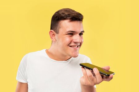 Caucasian young mans half-length portrait on yellow studio background. Beautiful male model in shirt. Concept of human emotions, facial expression, sales, ad. Recording voice message and smiling.