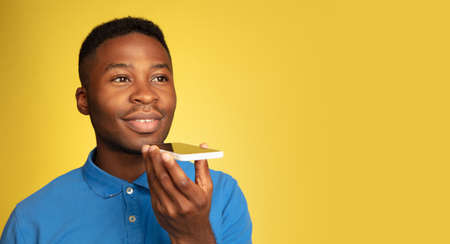 Recording voice message. Young african-american mans portrait isolated on yellow studio background, facial expression. Beautiful male model, copyspace. Concept of human emotions, sales, ad. Flyer