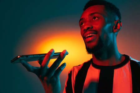 African young man with phone isolated on color studio background in neon. Concept of human emotions, facial expression.