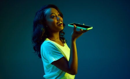 Portrait of smiling, young african woman recording voice message on phone against cyan, blue studio background in neon light. Communication