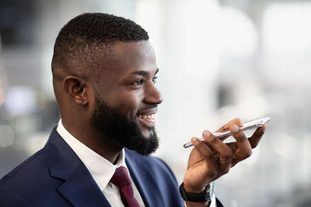 Closeup of handsome black businessman recording audio message