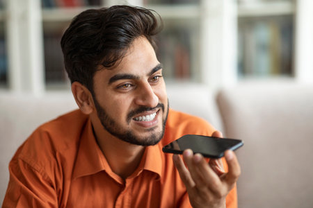 Closeup of happy arab man recording voice mail on smartphone