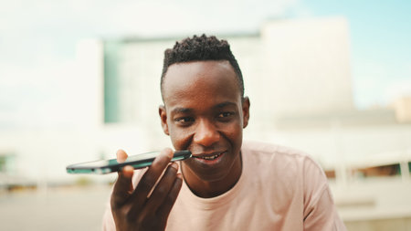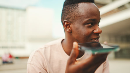 Closeup of happy black man recording voice mail on smartphone