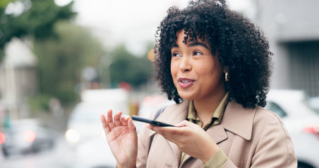 Business woman, voice note and outdoor for mobile, networking and speaking with contact. Technology, cellphone and female consultant with chat for vacation, talking and conversation for communication