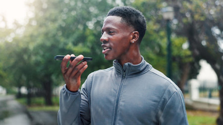 Runner, phone and speaker with black man in park for fitness tracking app, workout timer and reminder. Record, health instruction and voice memo with person in nature for mobile, training or schedule