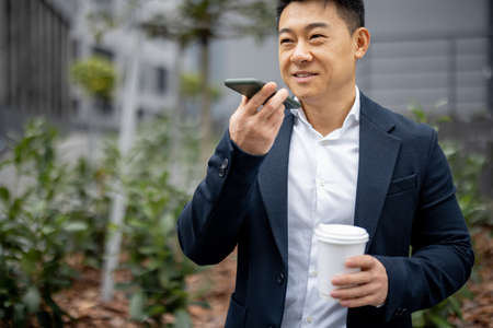 Modern chinese businessman sending a voice message on his mobile