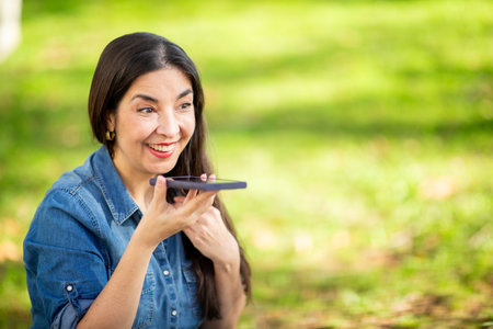 Smiling woman in a denim shirt sitting in a park with green grass and trees in the background, holding her smart phone close to her mouth while recording a voice message
