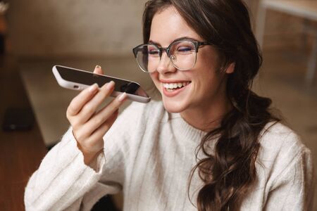 Cute dark-haired smiling girl recording a voice message
