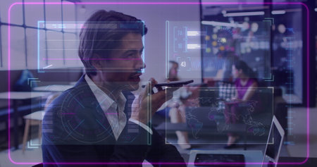Image of data processing over caucasian businessman using smartphone in office. Global business, finances, computing and data processing concept digitally generated image.