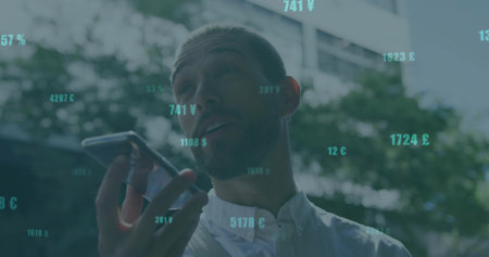 Speaking adult businessman using smartphone at road outside office building, financial data overlay. Technology, finance, digital, corporate, communication, innovation, modern