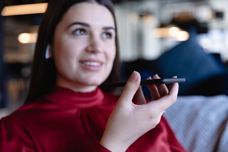 Woman holding smartphone device, using voice recognition function, recording audio message or talking with mobile assistant. Authentication, communication, online technology concept