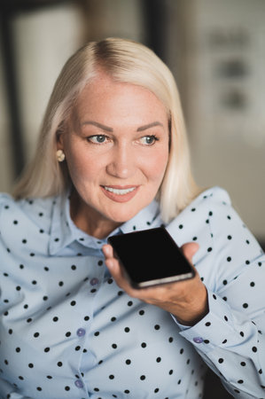 Woman holding smart phone talking with digital assistant.