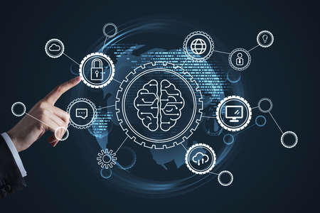 Digital information technology concept. Businessman touching artificial intelligence icon.
