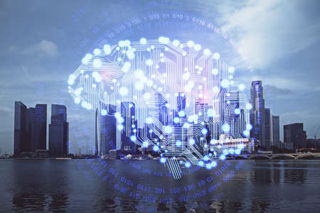 Brain hologram drawing on cityscape background multi exposure. Ai in modern city concept.