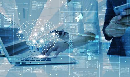 Internet of Things (IOT) technology with AR (Augmented Reality) on VR dashboard. Business team meeting. Photo professional investor working new start up project. Finance task.Digital tablet docking keyboard laptop