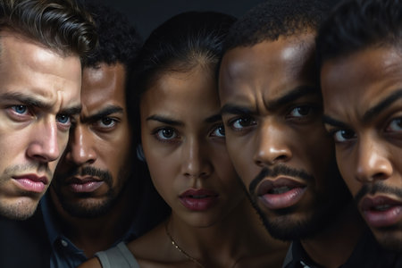 Close-up of five people with different skin tones and hairstyles, possibly models or actors, standing together in a tight group, looking directly at the camera with serious expressions.