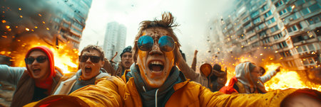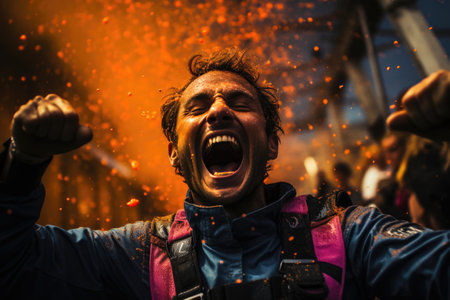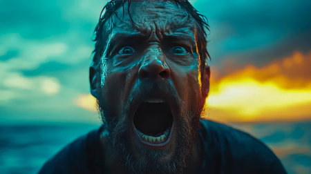 A rugged man yelling passionately with wide eyes in a dramatic outdoor setting, with a vibrant sunset backdrop. High-energy and emotional.