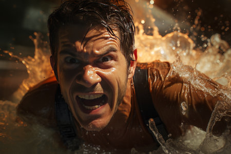 A man expresses strong emotions while shouting droplets of water glistening on his face under vibrant lighting creating a powerful visual impact.
