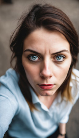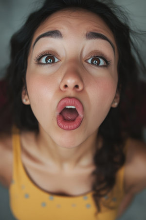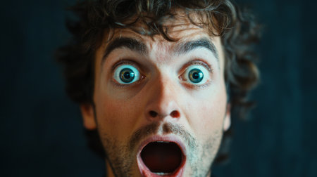 A close-up portrait of a surprised person with wide eyes and an open mouth, capturing genuine astonishment and emotion. The intense expression evokes curiosity and engagement.