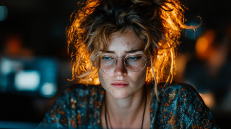 Contemplative portrait of a young woman with round glasses and freckles, illuminated by warm backlight.