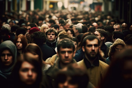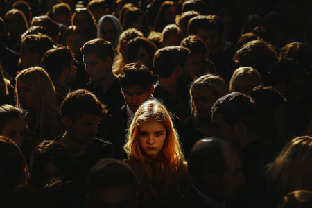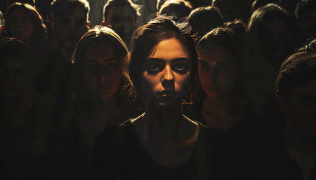 illuminated attractive woman's face stands out from a crowd of anonymous people in the shadows