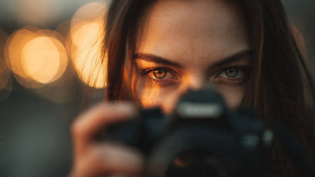 Young woman with a camera in her hands. Close-up.