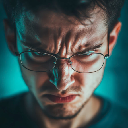 A young man with glasses shows intense frustration and anger, his forehead creased and eyes glaring. The background has a soft blue glow, enhancing the tension in the atmosphere.