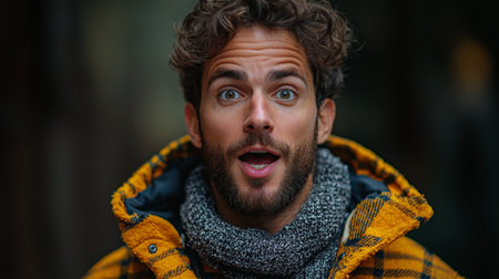 A candid portrait of a man in a yellow jacket with a surprised expression, set against a blurred scenic backdrop.