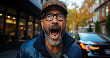 A bearded man wearing glasses and a camouflage hat is looking very surprised with his mouth wide open. He is standing in an urban environment with cars and buildings in the background.