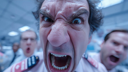 Close-up of an angry man shouting with intense expression in a chaotic office setting, capturing raw emotion and workplace stress.