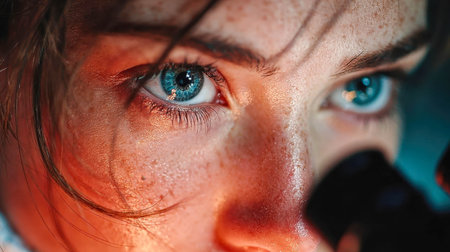 Extreme close-up of female scientists intense blue eyes under laboratory lighting, wearing protective headgear.