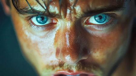 Extreme close-up of a man's intense blue eyes and sweaty face, showing raw emotion and focus.