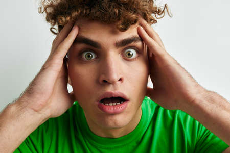 kinky guy in green t-shirts emotions posing isolated background