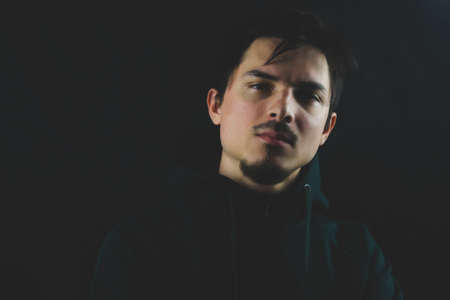 Portrait of young man on the black background. male face