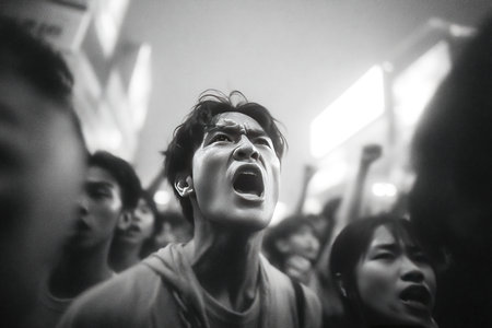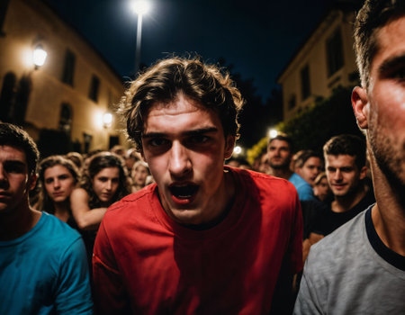 Men and women passionately express their beliefs by shouting together, their vibrant t-shirts contrasting against the muted tones, embodying unity and determination.