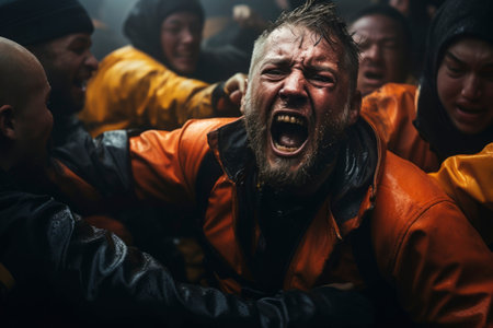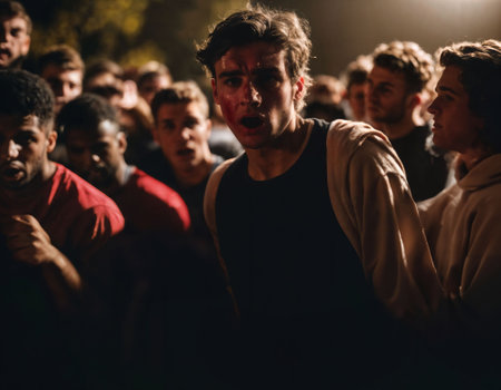 photo group of rage angry teenage college boy fighting the other with wound on face, generative AI
