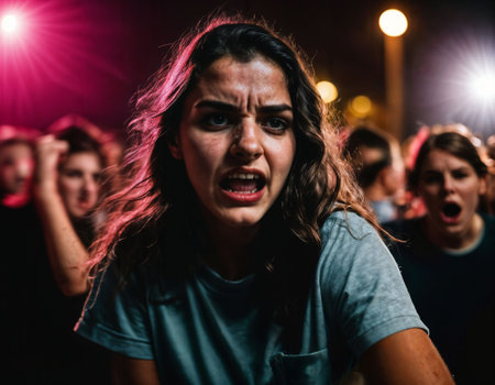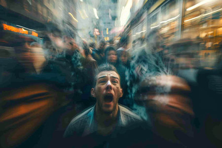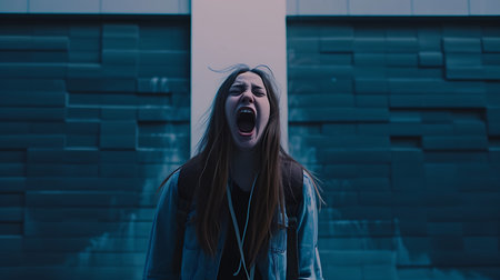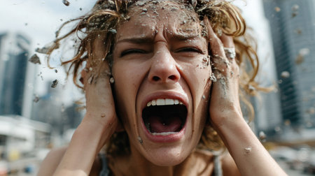 A powerful image capturing a woman in a moment of intense frustration against an urban backdrop, showcasing raw emotion and the chaos of city life.
