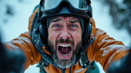 A man, dressed in appropriate winter attire, is caught in an exhilarating moment, screaming in excitement as he skis through a snowy landscape, capturing the essence of thrill and adventure.