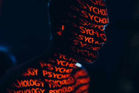 Young adult man with word Psychology on his face in the dark.