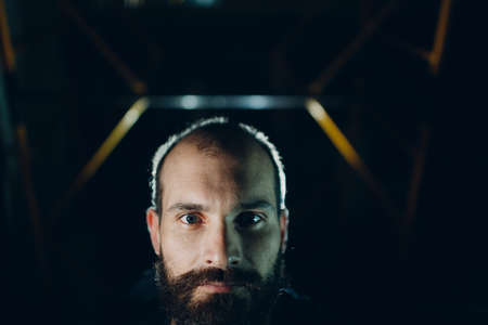 Backlit bearded adult man portrait in dark.