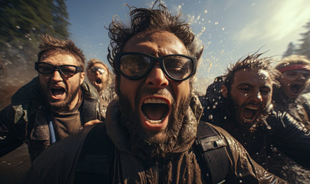 Close-up of a determined rescue medic with muddy face during an emergency operation in a forest.