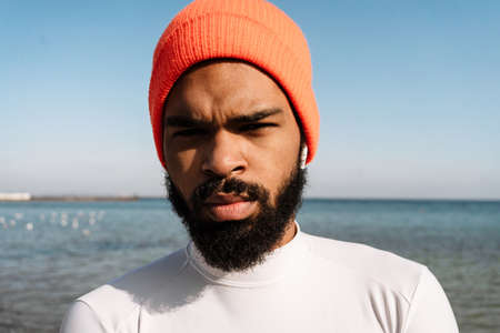 Handsome african american sportsman in earphones working out at beach
